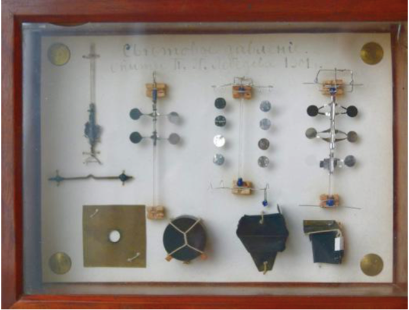列别捷夫为其实验装置制作的各种叶片及其他部件(现存于莫斯科列别捷夫物理研究所)。上方文字说明:”光压实验,P·N·列别捷夫,1901年”。内框尺寸:12×17厘米。(图片来源,见注释[8])