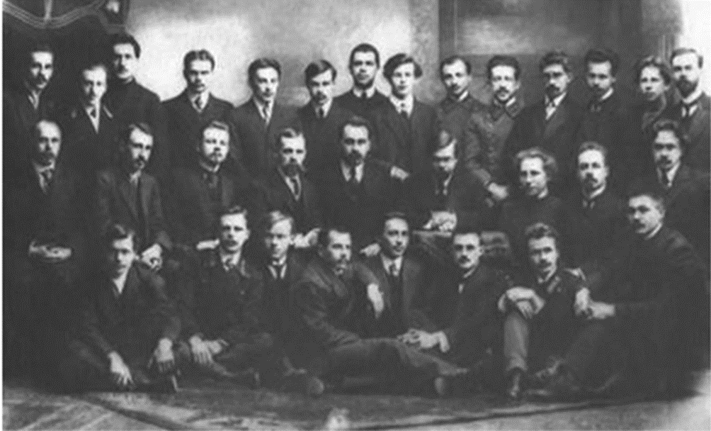 列别捷夫的实验室成员小组。该照片拍摄于列别捷夫1912年去世后不久。中间一排坐着的从右往左第四位为拉扎列夫。最后一排站立的从左到右第七位为瓦维洛夫。(图片来源见注释[1])