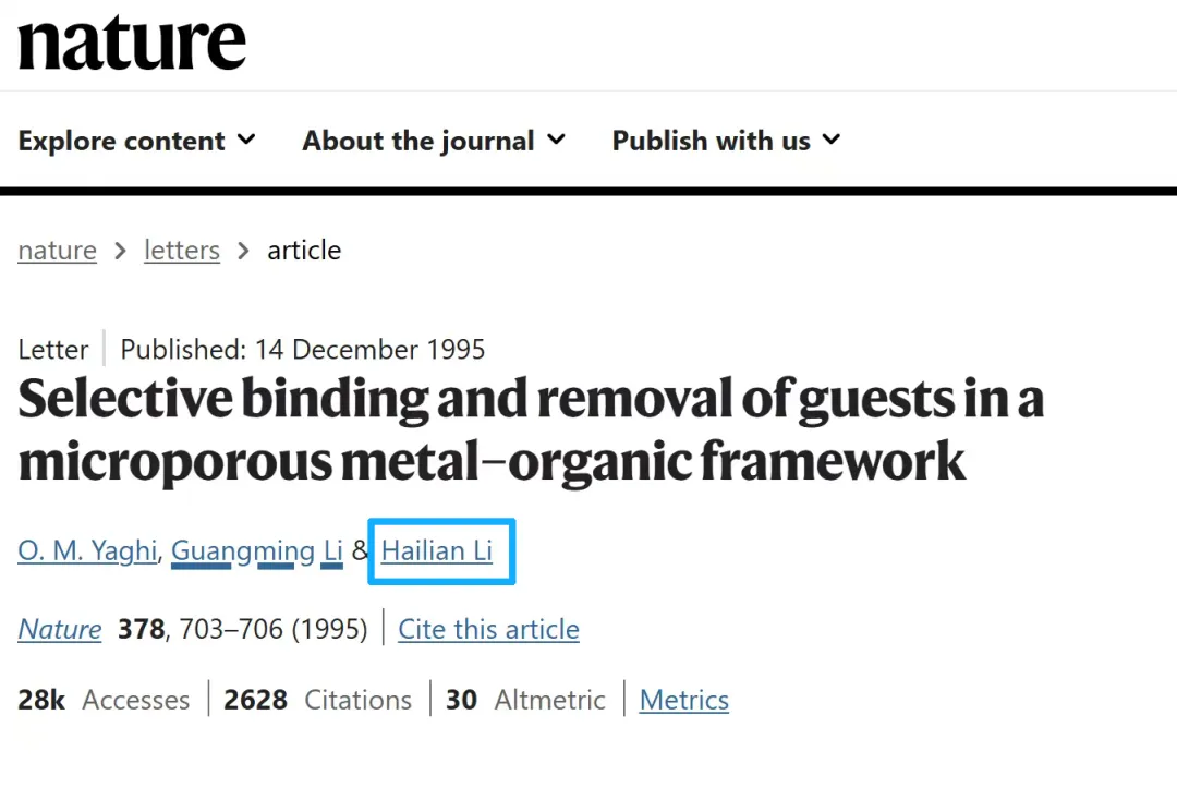李海连通过这样一次偶然的机会认识了奥马尔,后来他联系奥马尔表示想去美国读博士,奥马尔那时候刚好拿到了亚利桑那州立大学助理教授的职位,就同意了。奥马尔告诉李海连,这是一个新的实验室,我们可以做一些新的东西。之后也正是李海连按照奥马尔的想法把有机的和无机的这些分子砌块混到一起,得到了MOF-5这种闪闪发光的立方体晶体,成为了奥马尔第一篇金属有机框架文章的三位作者之一。