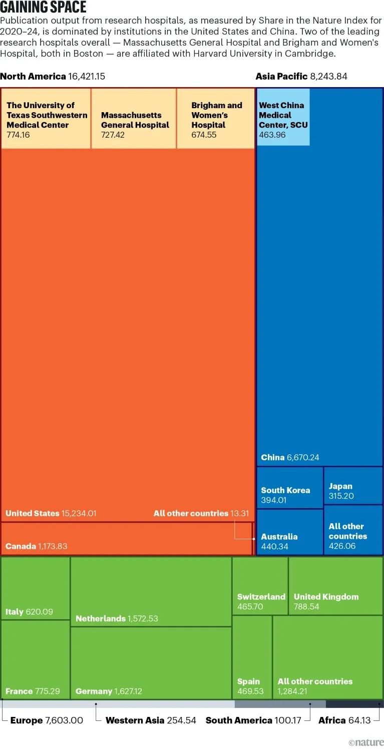在全球排名前200的研究型医院中,超过四分之一(51家)位于中国,数量仅次于美国(69家),德国以20家位列第三。在中国医院中,科研表现最为突出的是位于成都的四川大学华西医学中心。基于2020至2024年间发表的研究论文,该中心已跃居全球第九,而其在2019年时仅排名第24位。中国医院的上升势头十分强劲:在全球排名进步最快的前25家研究型医院中(按2023至2024年间的份额增幅计算),有16家来自中国。