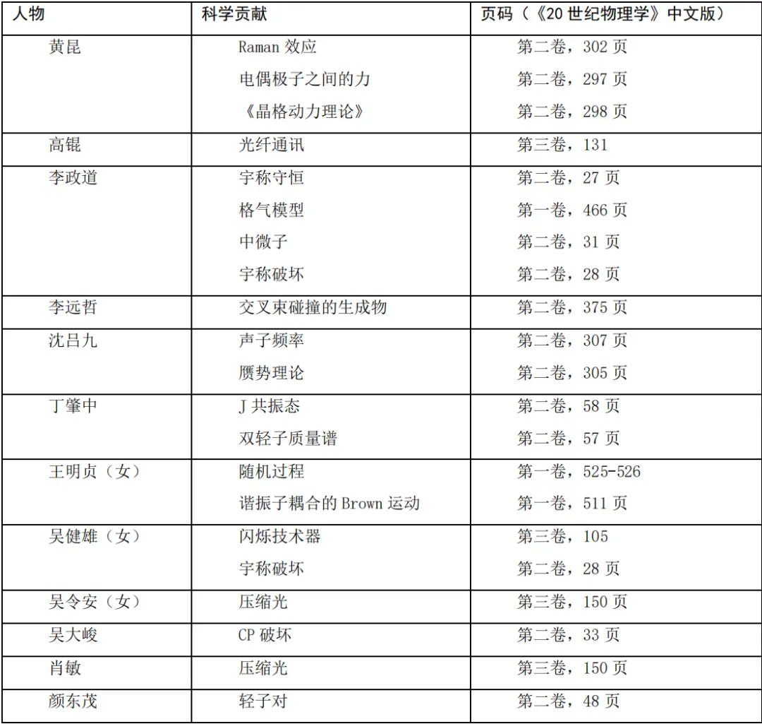 由上述统计可以发现,除杨振宁外,《20世纪物理学》一书中还提到了上述12位华人物理学家的工作,涉及5个物理学领域。