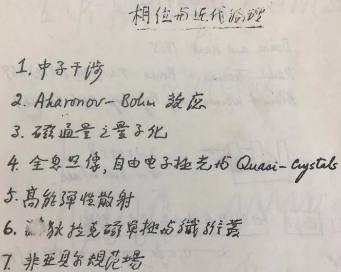 1986年5月前后,杨振宁先生在中国科学院研究生院系统讲授一门名为《相位与现代物理》的短期课程,内容共有7个topic(图3):(1)中子干涉;(2) Aharonov-Bohm效应;(3)磁通量之量子化;(4)全息照像,自由电子激光与准晶;(5)高能弹性散射;(6)狄拉克磁单极与纤维丛;(7)非亚(阿)贝尔规范场。杨先生讲的这些内容出乎当时听课者的预料和期望,那时在中国理论物理学界被认为“高大上”的是超弦、场论和粒子物理,而杨先生讲的这些大家大多并不熟悉,却体现了“20 世纪物理学的真精神的东西”。若干年后,我读了杨先生在巴黎国际理论物理会议上的报告“20世纪物理学的三个主旋律:量子化,对称性,相位因子”,我才体会到杨先生所指的“真精神”是什么,他多年前讲的东西为什么经常会成为物理学的主流。
