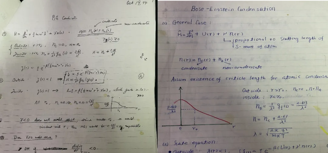 那时候只要杨先生不出差,杨先生几乎每个周末都与我们有长时间讨论, 甚至跟杨先生在一起去推导具体的方程。杨先生亲自动手演算,对此我印象非常之深。有一次,我推导杨先生和Byers合作的那篇关于磁通量子化Byers-Yangtheorem的文章。我觉得文章中的一个公式有符号的问题,结果我们俩一起仔细检查推导了一下午,最后又翻出来杨先生过去的算稿,仔细比较后,才发现还是我错了。杨先生还指导我研究冷原子的玻色爱因斯坦凝聚,我跟随他一起计算了一些非常具体的东西,图5左边是杨先生的算稿,右边是我的算稿,我只是把杨先生研究的谐振子势推广到更一般的约束势。1993年杨先生访问东北师大,在学术座谈会上他还专门强调了冷原子和玻色爱因斯坦凝聚研究的重要性,说它们是未来十年物理学的重要新领域。