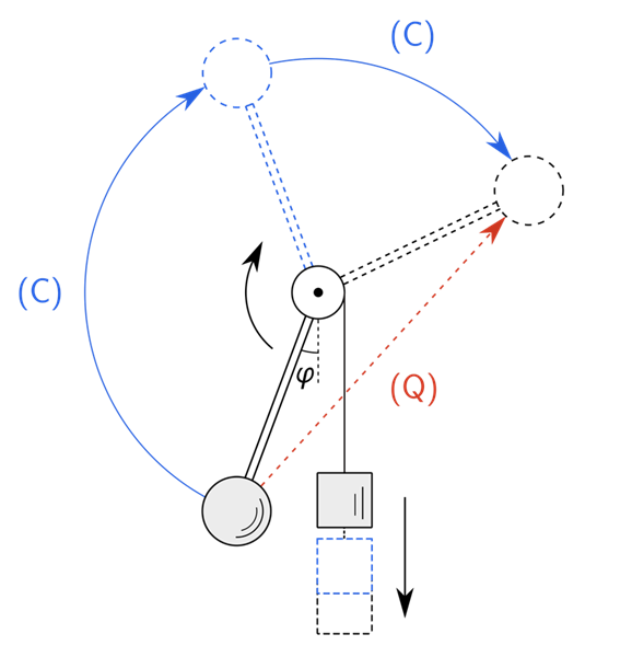 电流偏置约瑟夫森结的等价宏观力学模型:圆形单摆相对于竖直位置的夹角 φ 对应约瑟夫森结两侧的相位变量差;另一块方形重物通过细绳缠绕悬挂在摆轴上,代表外加偏置电流对系统能量的影响;蓝色实线 (C) 与红色虚线 (Q) 分别指代单摆顺时针摆至平面右侧的经典力学轨迹与量子隧穿过程。上下两图中以相同记号标注的物体势能局部最低点(黑色实线)、局部最高点(蓝色虚线)和逃逸后位置(黑色虚线)逐一对应——它们是同一物理模型的不同直观图像展示。