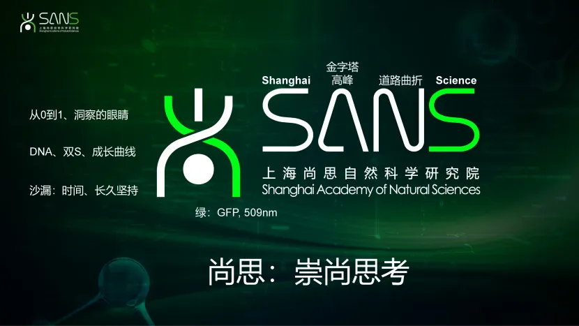 尚思的“尚”字,构成了我们的Logo。“尚”字下面一个“0”,上面一个“1”,这代表我们追求从0到1的原创。中间的交叉可以看作DNA的双螺旋,也代表了科学学科的交叉。其中的一条臂,我们特意选择了GFP(绿色荧光蛋白)发光的颜色(509nm),它的发现也是一个有巨大影响力的工作,后来得了诺贝尔奖。