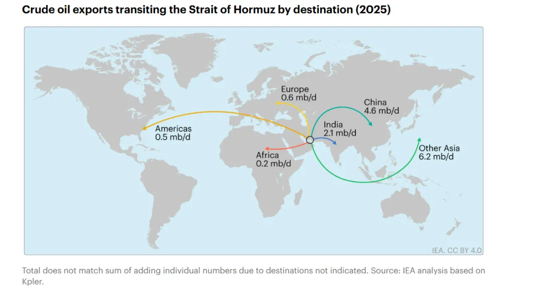 2025年,中东海湾地区约80%的原油、90%的液化天然气(LNG)经由霍尔木兹海峡出口至亚洲。[7] 这意味着亚洲能源买家将首先承受供应压力,并在下游产生连锁反应。