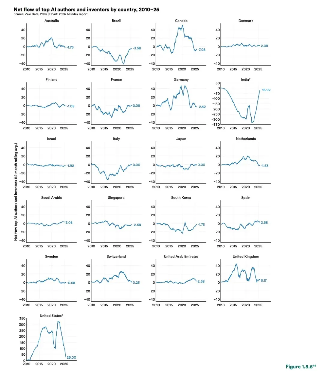 但这一优势正在减弱,自 2017 年以来,移居美国的顶尖 AI 研究人员和开发人员数量下降了 89%。净流入规模从2022年的峰值324.6下降至2025年的26.0。