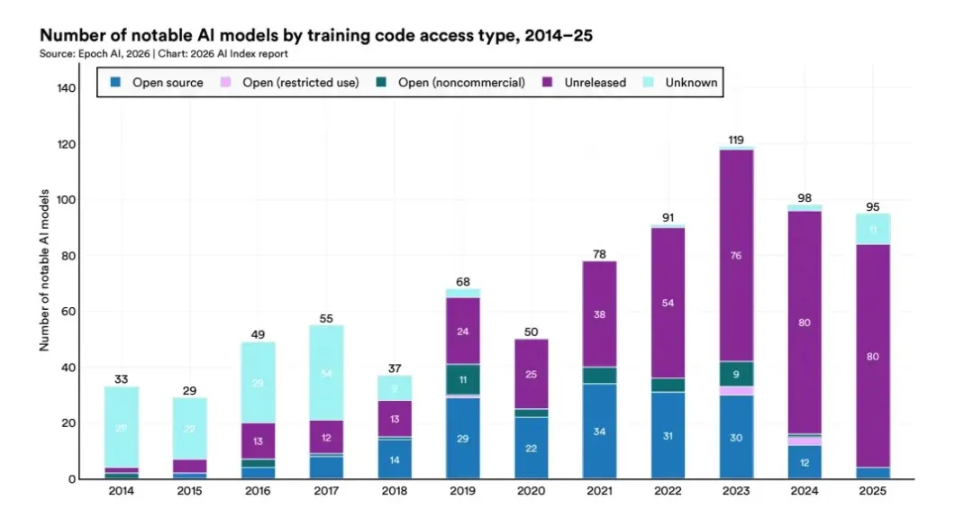 在2020年,开源与未公开训练代码的模型数量还是大致相当的。但到了2025年,在95个重要模型中,有80个未公开其训练代码,仅有4个实现了代码开源。