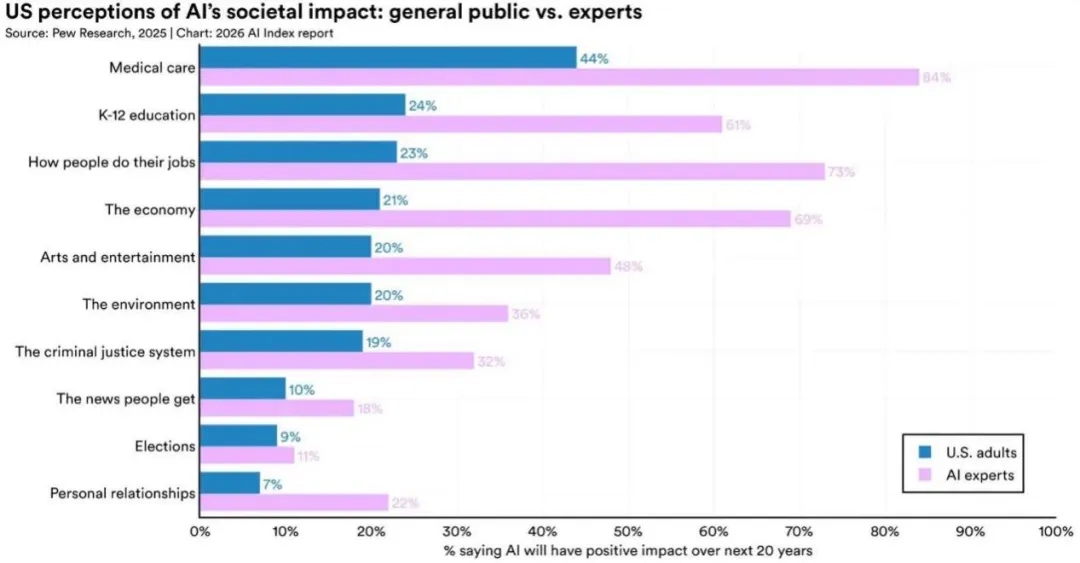 从治理上看,民众对AI的信任程度并不高。根据皮尤(Pew)调查,专家与公众对AI的预期已经出现了明显的分歧。在美国,73% 的专家认为 AI 会对工作产生正面影响,而公众中持相同看法的仅为 23%。近三分之二的美国人(64%)预计人工智能将在未来 20 年内导致就业岗位减少,而只有 5% 的人预计会增加就业岗位。在医疗和经济方面,双方同样分歧严重。