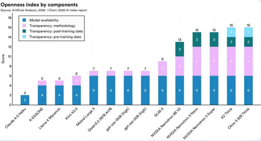 2025年,产业界贡献了超过90%的代表性AI模型,但最强的模型仍然主要是闭源模型。训练代码、参数规模、数据集规模与训练时长等关键信息,在OpenAI、Anthropic和谷歌等资源投入最密集的模型中,已基本停止对外披露。