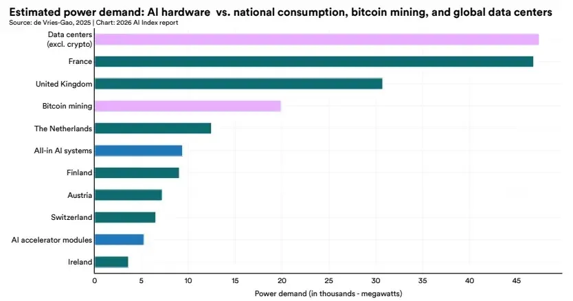 从规模上看,整体AI系统的用电需求已接近瑞士或奥地利的全国电力消费水平,也大约相当于比特币挖矿的一半。在不计入加密货币的情况下,全球数据中心的电力需求约为47000 MW,其中AI硬件所占比例正在持续上升。