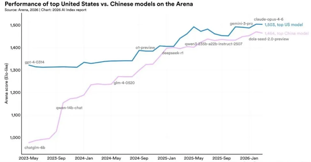 2025年,美国产出了50个代表性模型,中国产出了30个。根据各个模型在Arena排行榜上的得分,截至2026年3月,Anthropic的顶级模型在Arena排行榜上以Elo分1503领先,差距约为2.7%,且在过去一年中一直在持平到个位数范围内波动。